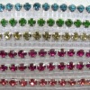 colored pointback glass rhinestone mesh trimming for Komini collar 1: stitch on Kimono collar, other garment, bags 2: stone material: glass, Grade A 3: mesh material: polyester 4: stone color: White AB, clear, Tanzantie, Fuchsia, Rose, Light Gold, Aqua, Peridot, Sapphire, Jonquil 5: mesh color: white 6: factory day capacity: 1000 yard 7: MOQ: 5000 yard 8: lead time: 15 days 9: payment: 30% T/T in advance as deposit, 70% T/T before shipment